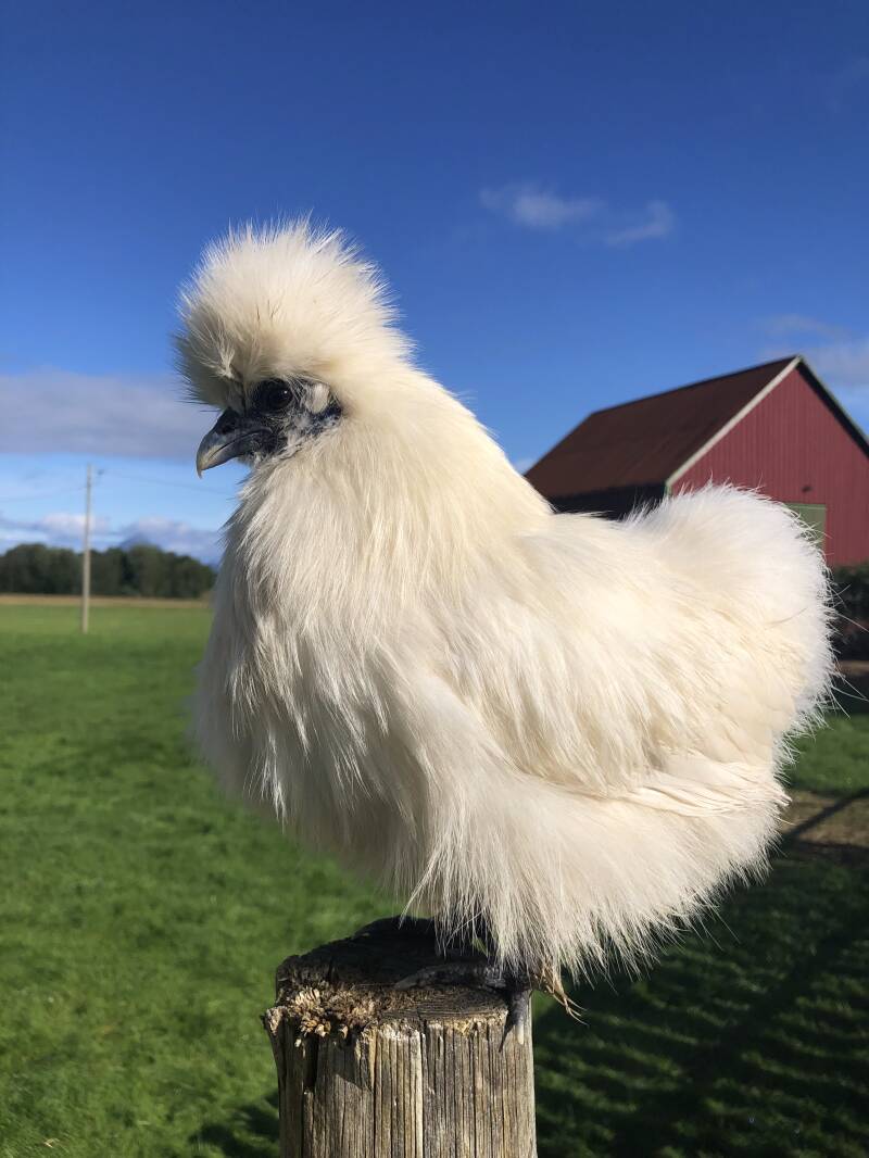Blondie er ei hvit dvergsilkehøne som kom flyttende til gården fra Sarpsborg i 2022. Det heter seg at Silkehøner ikke er så smarte, men Blondie er i alle fall en av de snilleste hønene vi har. Hun deler maten sin med alle, og er ganske lett å fange dersom det må gjøres.